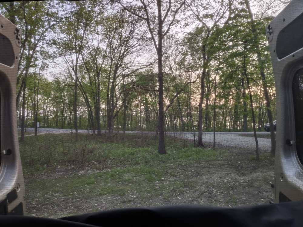 Looking out the back doors of our van at Mark Twain State Park, Missouri. There is a lake on the other side of the trees.