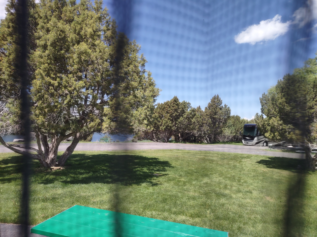 View of back of camper with reservoir in distance